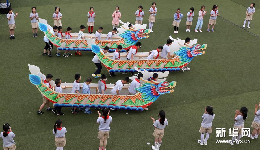 6月22日,江蘇省蘇州市留園中心小學(xué)學(xué)生在進行“旱地龍舟”比賽。新華社發(fā)(杭興微 攝)