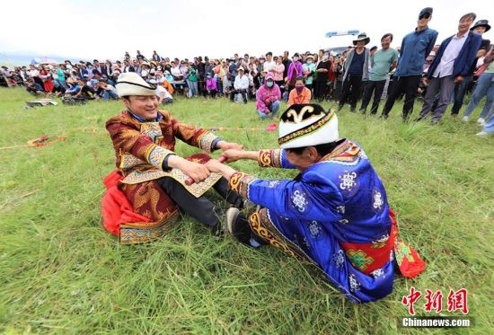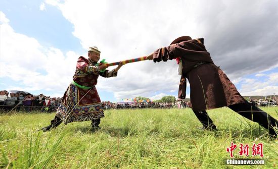 8月8日,甘肅張掖市肅南裕固族自治縣皇城鎮第十六屆民族文化旅游藝術節暨傳統體育運動會拉開帷幕。賽馬、押加、拔棍、頂杠子、射箭、背垛子等一項項少數民族傳統體育運動項目,吸引上萬觀眾觀看。近年來,肅南縣將體育項目與歷史、民族、文化、旅游有機結合,打造民族體育節慶品牌和運動會,使民族傳統體育發展增加了新的內涵,逐步形成了全民健身品牌,影響力不斷擴大。圖為參賽選手進行拔棍項目比賽。 趙琳 攝