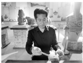 馬黑麥記得,小時候在自家對面廢棄的燒瓦罐的土窯附近,經常能看到破損的陶罐碎片,他把碎片拿回家自己嘗試著拼湊,雖然第一次修復彩陶以失敗告終,但是修復古彩陶的種子在他心里開始慢慢發芽。“破損的彩陶像一盤散沙,碎片先要用藥水清洗,清洗完的碎片按照花紋再用膠水粘起來。”刺鼻的藥水、殘缺的碎片、復雜的花紋,這些都沒有讓馬黑麥停止對彩陶的熱愛。“我喜歡彩陶,彩陶的每一塊碎片是有價值的,是需要保護的,我開始研究這些破損的彩陶碎片,希望能復原其千年以前的模樣。”