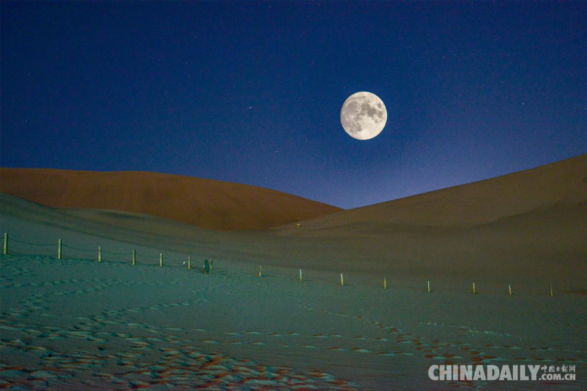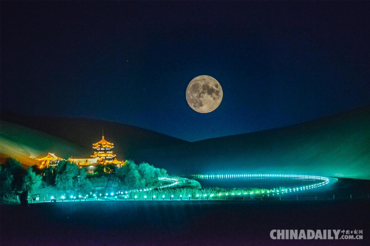 9月21日夜晚,一輪明月升起在大漠敦煌的上空,在中國傳統的中秋節,甘肅敦煌月牙泉小鎮中心廣場舉辦了中秋拜月等民俗活動。先舉行了仿古“拜月大典”。伴隨著深沉悠揚的樂曲,身穿華麗漢服的參祭女子手捧月餅及各式貢品緩步登臺,在皓月銀輝中虔誠致祭;按照敦煌習俗,主祭三上香、三祭酒,并于月光與燭光映照之中,向月誦祝。按照傳統儀式祭拜禮成后,主祭將月餅與水果分發給現場拜月的市民游客,與大家共享中秋拜月祭品。隨后還進行了中國傳統民族服裝——旗袍展示、漢服秀、歌舞演出等形式多樣的民俗活動。當日晚,小鎮人來人往非常熱鬧,眾多敦煌市民和游客參加拜月活動,受疫情影響,部分活動在網上進行,不少媒體人,對敦煌賞月、拜月活動進行了網絡直播。