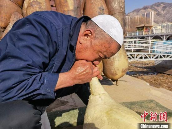 張德寶將處理好的羊皮扎好,留下一個口,往里面吹氣,使其鼓起來,最后捆扎在木架上完成。張德寶介紹說,1個羊皮囊他最快可以用30秒吹好,用嘴吹氣,其溫度和濕度更適宜羊皮筏子保存,如果使用過程中漏氣了,也需靠人吹補氣。(記者 劉玉桃)