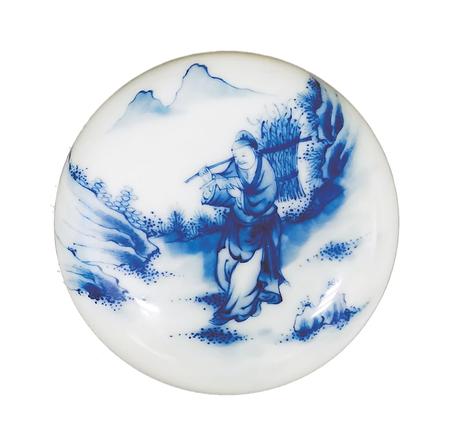 一件是青花印泥盒,制作于20世紀初。直徑7厘米,高3厘米,盒身扁圓,鼓腹,上下相合。盒蓋用青花繪“樵夫讀書”圖。畫面遠處,兩座山峰高聳云間,四周樹木蔥蘢,山石嶙峋。畫面正中的山路上,一樵夫砍柴歸來,身背一大捆柴草,他右手扶著木棍,左手則捧著一本書,雙眼盯著書本,緊抿嘴唇,正津津有味地邊走邊讀。讀到精彩處,露出會心一笑。看來,這個樵夫是極愛讀書的,這種好學精神,難道不值得我們學習嗎?這件瓷印泥盒,青花色澤典雅,人物衣褶神態描繪細致,栩栩如生,胎體堅致,白釉溫潤,層次清晰,保存完好。