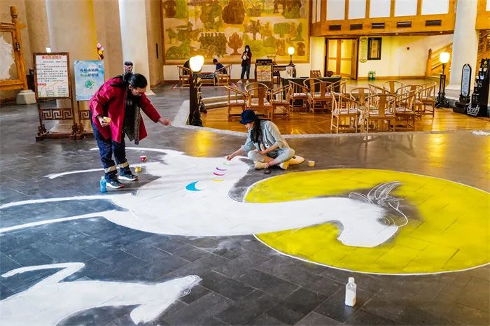 5月8日,母親節,酒泉敦煌市沙文化館以敦煌莫高窟九色鹿壁畫為摹本,以彩色沙為原料,5人團隊通力合作,在敦煌鳴沙山下的敦煌山莊大堂“繪制”出長10米寬6米的大型九色鹿沙畫,同時“繪制”了一幅“三兔藻井”沙畫圖案,寓意天下母親“福祿安康”“一路平安”,祝天下母親節日快樂。