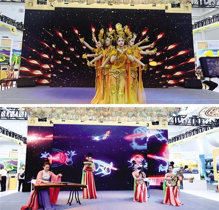 甘肅展區舞臺上,身著古裝的演員們生動演繹著《千佛》《散花飛天》《反彈琵琶長綢舞》等極具甘肅特色的敦煌古樂和敦煌舞蹈,令游人流連忘返。