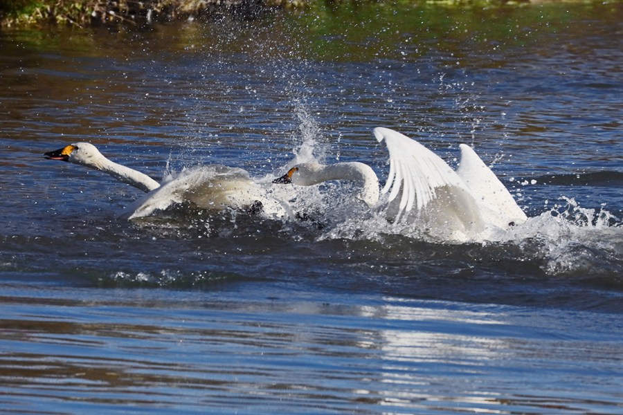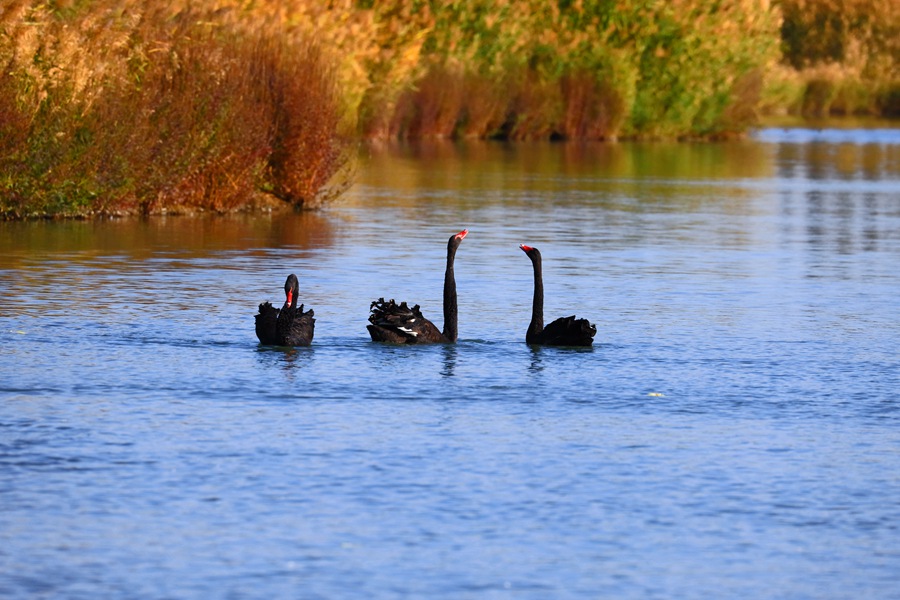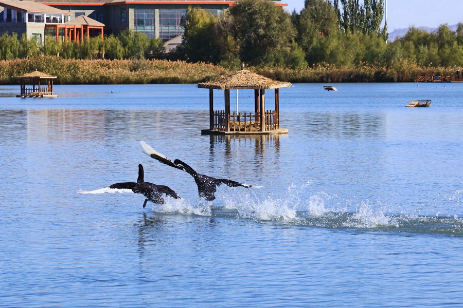 張掖國家濕地公園內,天鵝聚集在一起嬉戲。方艾琴攝