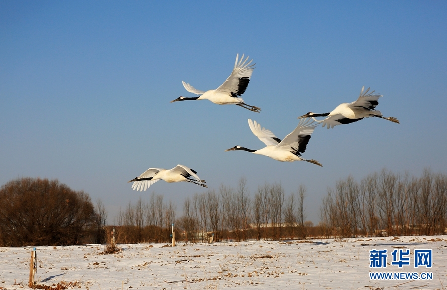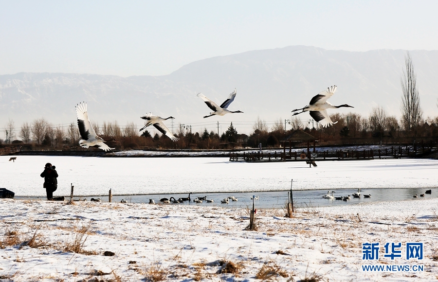 2月14日,雪后初晴,甘肅省張掖國(guó)家濕地公園放飛的十余只丹頂鶴翩翩起舞、嬉戲覓食,使雪后的濕地公園充滿生機(jī)。新華網(wǎng)發(fā)(陳禮 攝)