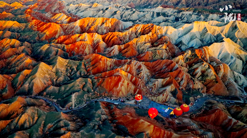 丹霞四季皆勝景,丹霞紅白相間的線條滑過橢圓形丘陵,宛如少女七彩裙擺處的流蘇,隨風搖曳,風情萬種。遠方低矮的彩色丘陵層層疊起,千姿百態,雄渾壯麗,如隱藏在山谷中的萬千疑兵,引人無限遐想。