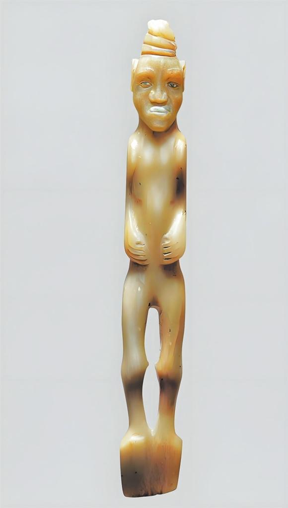 玉人形鏟高17.6厘米,1967年靈臺縣白草坡M1出土。圓雕工藝,人物裸體站像。發辮虎首蛇身盤成堆髻。長臉,闊鼻,深眼窩,大耳,厚唇前突,兩手捧腹,兩腿間呈“8”形鏤空,雙足并攏作鏟形。