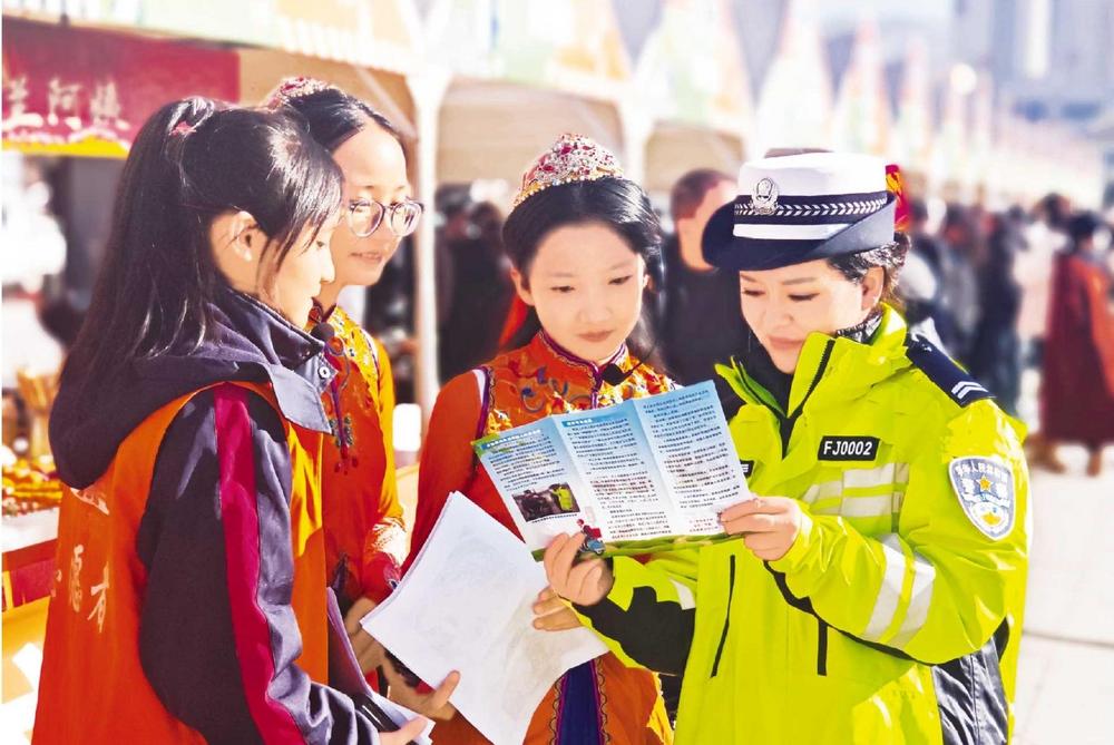民警向群眾講解交通安全知識。11月27日,廣河縣公安局交管大隊民警走進齊家文化廣場,利用戲曲進鄉(xiāng)村文藝匯演的有利契機開展交通安全系列宣傳活動。新甘肅·甘肅法治報通訊員 汪洋 攝