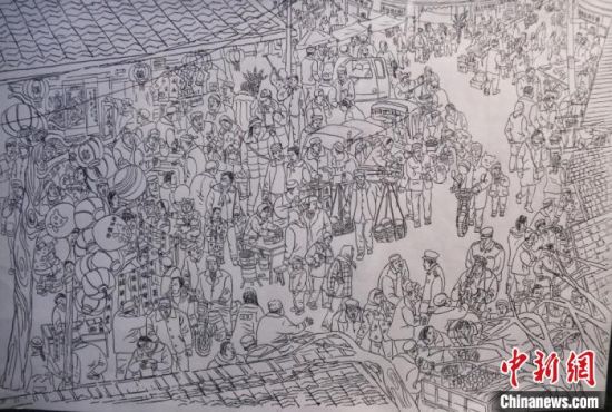 蘭州鋼筆畫愛好者周新平勾勒了數組關于鄉村記憶的鋼筆畫,其中,《隴西臘月圖》是他歷時三個多月,手繪了200多村民,完成的一幅舊時農民過年趕集的熱鬧圖景:賣糖葫蘆的小販、剪紙賀春的手藝人、趕車挑擔的趕集人……周新平說,他很怕“集市文化”將來被人們遺忘,用鋼筆記錄下來,留住記憶里的“年味”以感悟鄉愁。