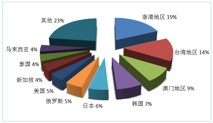 第三季度旅行社入境旅游接待人次排名前十位的客源地國家或地區由高到低依次為香港地區、臺灣地區、韓國、澳門地區、美國、俄羅斯、馬來西亞、日本、新加坡、泰國(見圖2)。