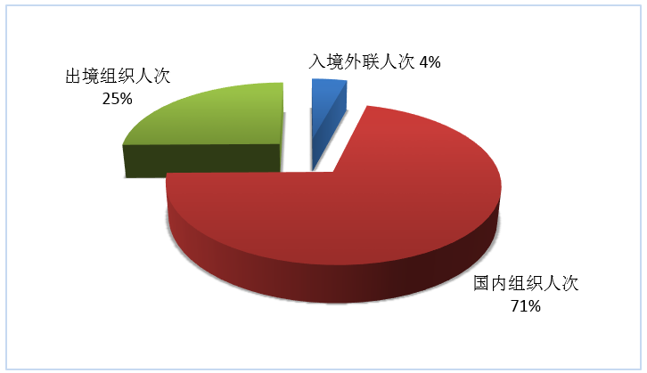 按照入境外聯人次、國內組織人次、出境組織人次三項指標,入境旅游、國內旅游、出境旅游市場人次所占份額依次為4%、71%和25%(見圖6)。