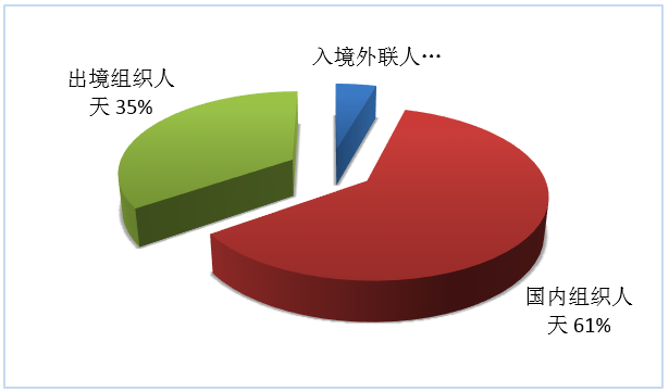按照入境外聯人天、國內組織人天、出境組織人天三項指標,入境旅游、國內旅游、出境旅游市場人天所占份額依次為4%、61%、35%(見圖7)。
