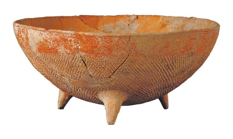 距今7800-7300年,這是只非常古樸粗糙的陶器,夾著細沙的紅陶,除了缽口內外裝飾的紫紅色寬帶紋就沒有別的裝飾了,造型卻也獨特,在圓形鈸底有三只短短的足。若說此彩陶缽再沒別的裝飾,似不準確,有細心的人會發現,缽身細密地布滿交叉網狀的繩紋。沒錯,這種繩紋是大地灣文化彩陶最為典型的特征,并不僅僅在這只彩陶缽上有,大地灣出土的其他彩陶上都有這個最具代表性的紋飾特征。但這種繩紋本就不是做裝飾用的,而是在制陶時壓印上這些繩紋使陶坯更加結實,另外,制成的缽碗等陶器有了這些繩紋可使得表面變得粗糙,人們可以捧得更牢,不容易失手摔碎。要知道,新石器時代早期生產力水平是多么的低下,遠古先民制這么一只彩陶器可是不容易呢。