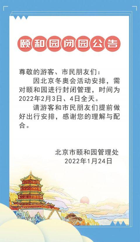 北京市頤和園管理處發布消息稱,為配合北京冬奧會活動安排,2月3日、4日全天頤和園景區將全園閉園。