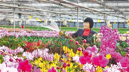 臨洮縣三易花卉種植基地的技術人員正在給蝴蝶蘭澆水。新甘肅·甘肅日報通訊員 邊國鵬