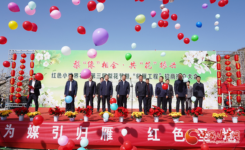 中國甘肅網4月21日訊(本網記者 李紅軍 通訊員 任建祥 馬麗麗)4月20日,平涼市靜寧縣界石鋪鎮李堡村彩旗飄飄、人頭攢動。界石鋪鎮第三屆“梨‘緣’相會·共‘花’振興”梨花節暨“歸雁工程”招商推介會在這里舉行,各界人士集聚梨園賞花游春,共商鄉村振興發展之計。