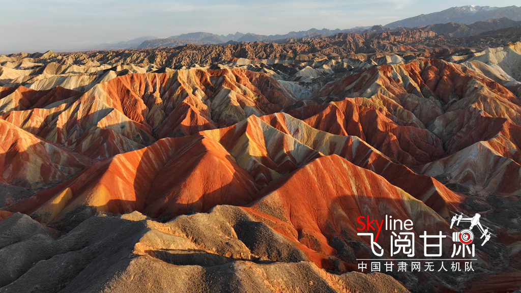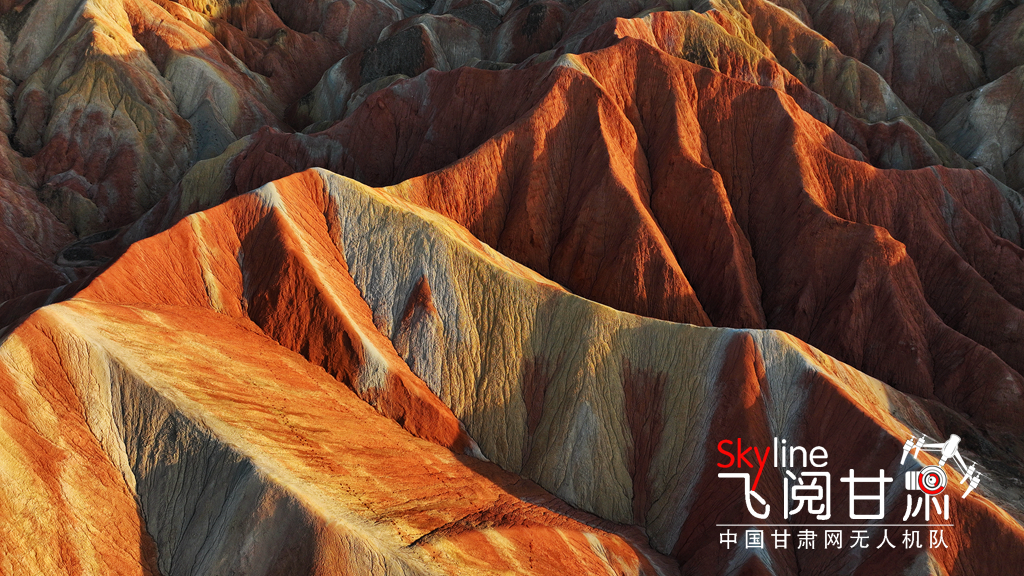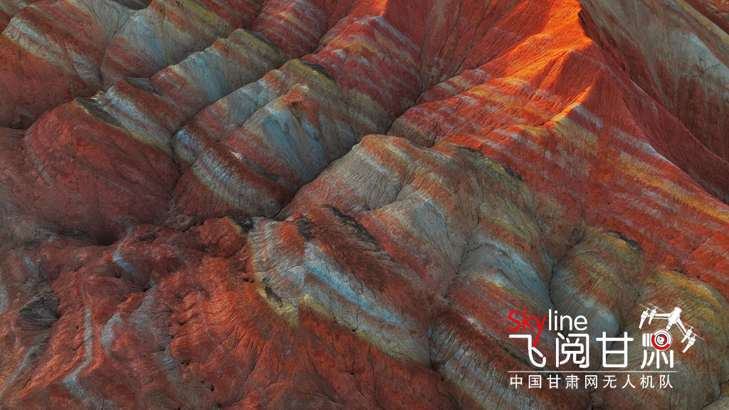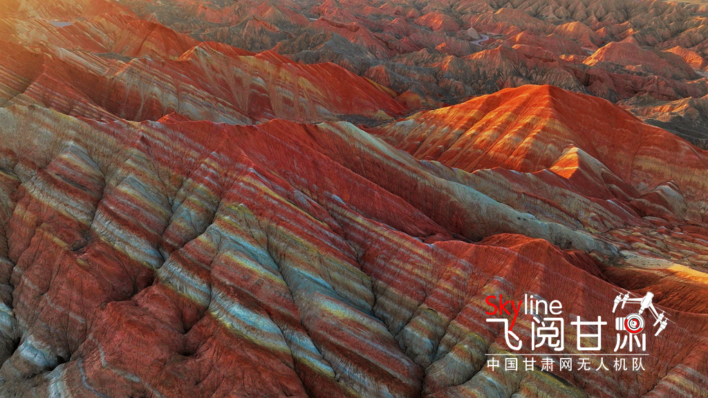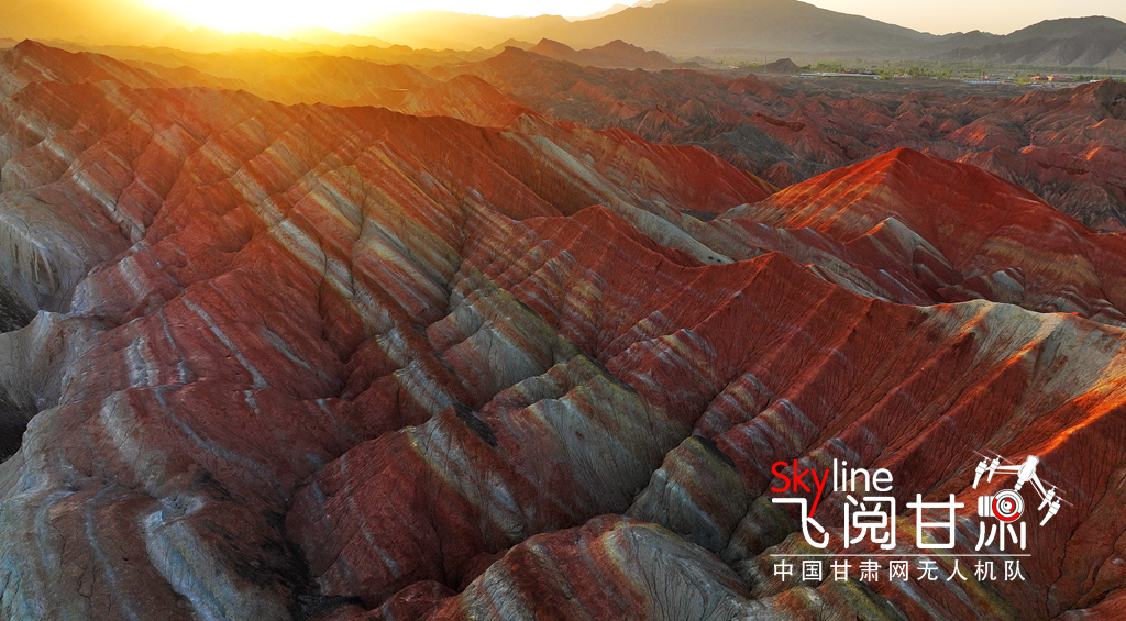 5月4日,落日余暉下的張掖七彩丹霞如同上帝打翻的調(diào)色盤,紅色、黃色、白色、綠藍(lán)色相間的山丘在陽光的照射下,像披上了一層紅色輕紗,熠熠泛光,色彩艷麗,堪稱大自然的涂鴉神功。
