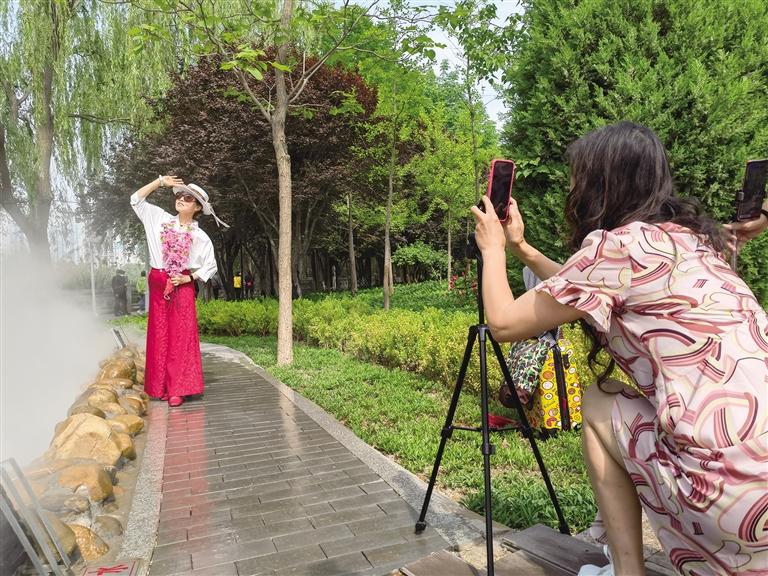 “一枝獨秀”團隊的王大姐和姐妹們帶著專屬攝影師正在這里攝影留念。王大姐告訴記者,這是她們今年第2次來這里打卡。“這里的花真美,每年我們都會來,拍照發在網上,收獲無數點贊,心情別提多美了。”說話間,姐妹們又擺了幾個造型,攝影師按下快門,精準捕捉唯美瞬間。“4公里外的寓言故事園最近也特別火,過兩天我們就去打卡。”王大姐說。