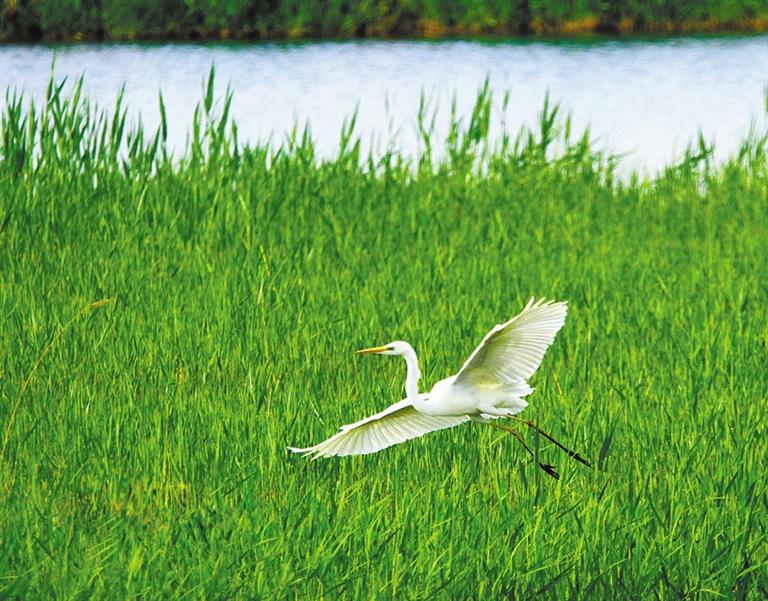 初夏的甘肅張掖國家濕地公園蘆葦青青,幾只白鷺在綠色的蘆葦中時而嬉戲飛翔,時而駐足覓食,成為濕地一道美麗風景。 人民網照片