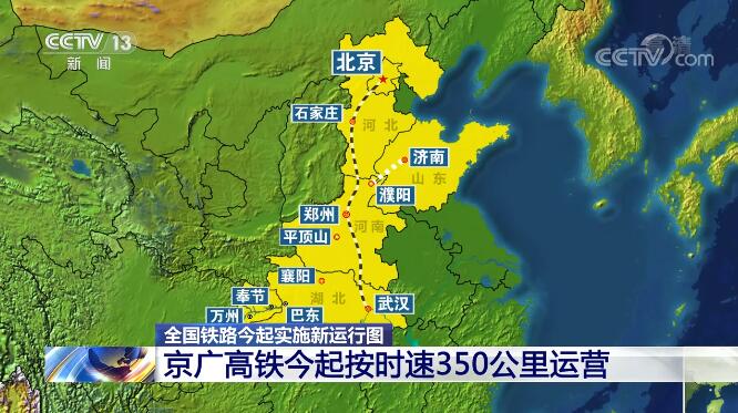 京廣高鐵從北京至武漢這一段,今天起按時速350公里運營,新型復興號智能動車組列車上線。從北京到武漢,旅行時間縮短到4小時以內。