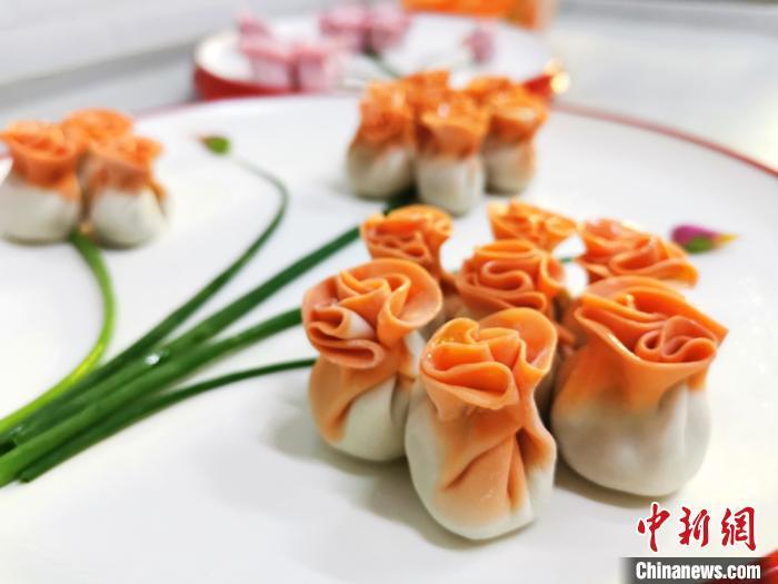 資料圖:圖為以胡蘿卜汁和面包成的“花餃子”,顏色艷麗。閆姣 攝