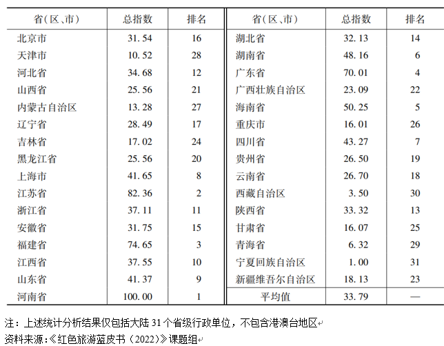 近日,北京第二外國語學院旅游科學學院與社會科學文獻出版社共同發布了紅色旅游藍皮書《中國紅色旅游發展報告(2022)》(以下簡稱《藍皮書》)。《藍皮書》指出,中國紅色旅游發展水平持續提升,31個省級行政單位(不含港澳臺地區)的紅色旅游發展指數排名中,位列前十的依次為河南省、江蘇省、福建省、廣東省、海南省、湖南省、四川省、上海市、山東省、江西省。