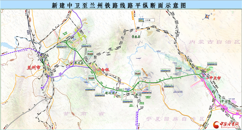 據了解,銀蘭高鐵中蘭段經白銀市靖遠縣北灘鎮進入甘肅境內,向南途經白銀市平川區、白銀區,蘭州市皋蘭縣、蘭州新區及永登縣,新建北灘站、平川西站、靖遠北站、白銀南站、秦王川站5座車站。線路向西連接中川城際鐵路進入蘭州西客站,向北直達中川機場并連通蘭張三四線,可經由武威、金昌,在張掖與蘭新高鐵連通,向東直通銀川,可轉向慶陽至西安,構建了蘭州到慶陽、平涼等地區的高鐵新通道。