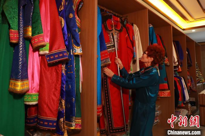 圖為娜仁其其格正在手工縫制傳統蒙古族服飾。陳坤 攝